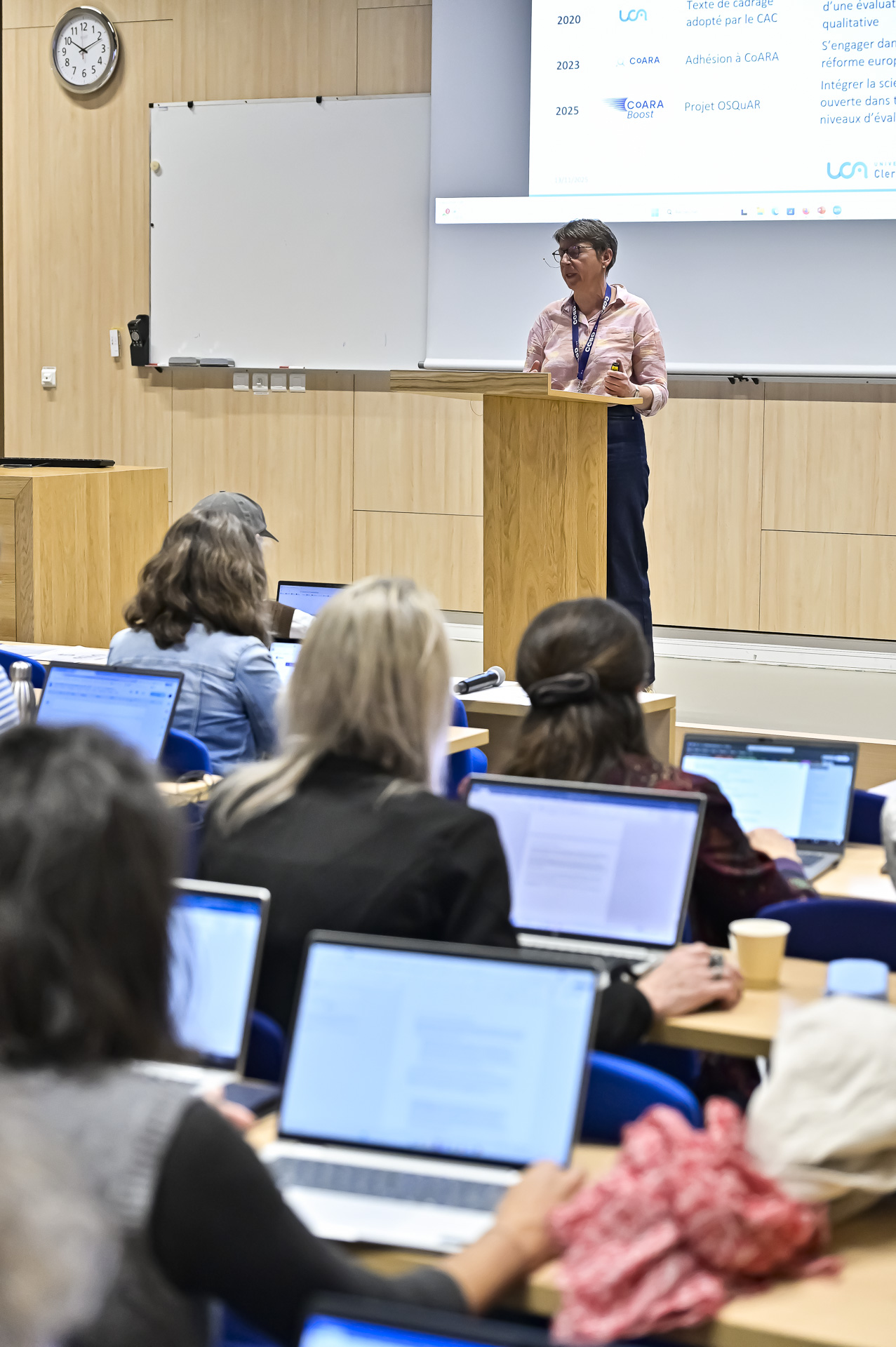 Valérie Legué, chargée de mission Science ouverte à l’Université Clermont Auvergne, est intervenue à cette occasion pour présenter le projet OSQuAR-UCA « Intégrer la science ouverte dans la réforme de l’évaluation qualitative de la recherche ». En tant que responsable scientifique du projet, elle a souligné l’engagement de l'UCA en faveur d’une évaluation plus qualitative, ouverte et responsable.